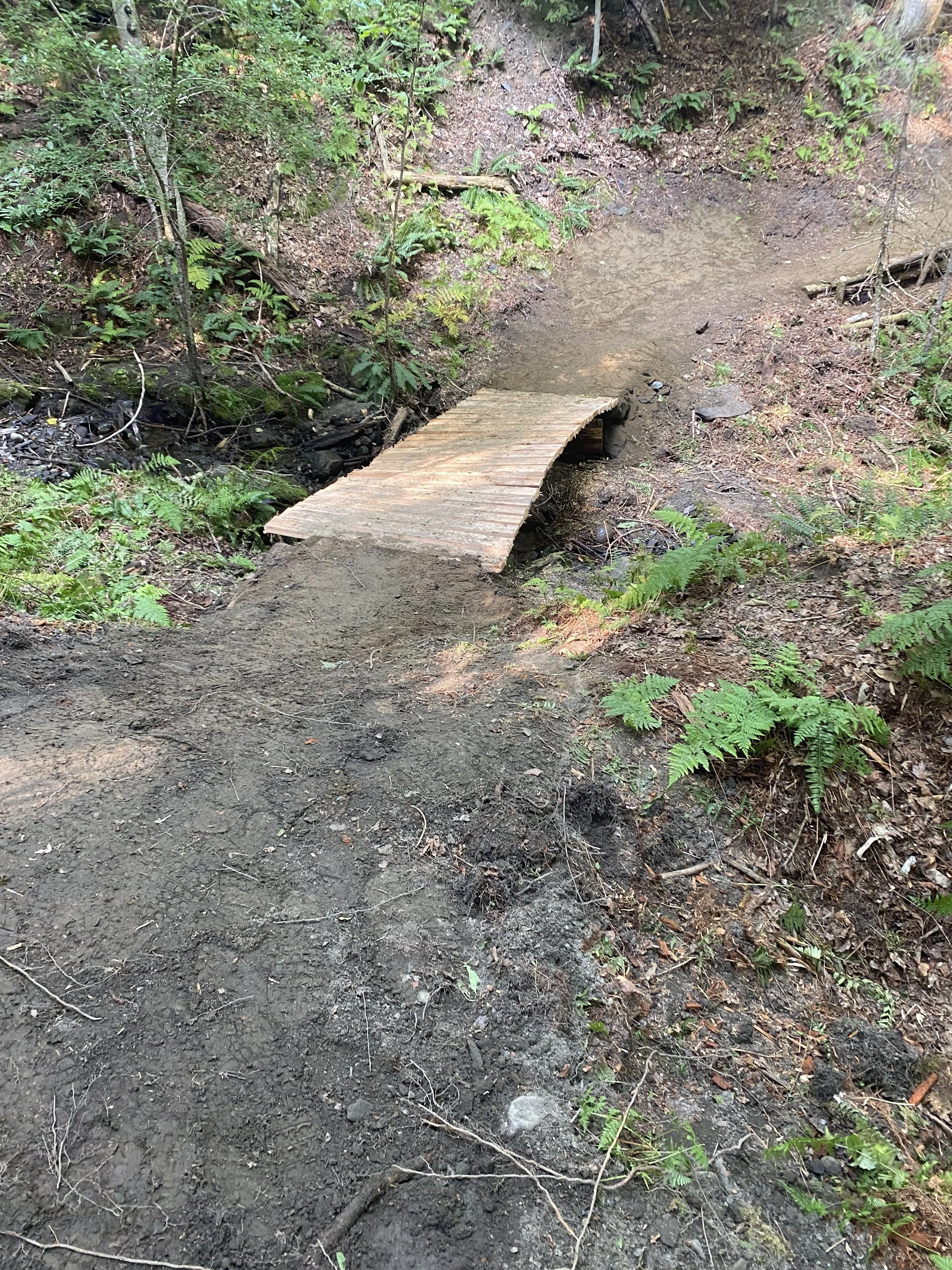A bridge on the trail crossing a portion of the ravine between Auld Lang Syne Road and the King Farm Road.